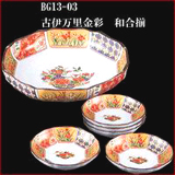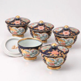 “华丽的古伊万里”是九谷烧的特色之一,碗外壁上部、下部及托盘内面外沿四周满錾缠枝花纹,整套茶碗造型朴实庄重,工艺精湛。 重量:约2.1kg 商品尺寸:八寸:直径24×5.2cm 约1.210CC 小碟:直径14.2×3cm