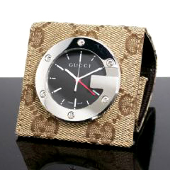 超大G-logo不锈钢钟框,顶级经典双G-logo折式精品包织布,运用顶级瑞士石英机芯,具备闹铃警示功能,钟面直径约47mm、厚约10mm,折叠收起时约63mm×63mm、厚约22mm,超奢华质感,让您外出携带更体面!