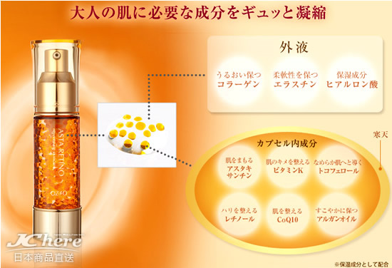 如果你感觉皮肤干燥缺乏活力,就不妨选择一款美容精华液:润滑的质地既适合按摩促进血液循环、养分深入滋润,又可提供充足的防护。作为JChere热销榜单的首款推荐品,ASTA RETINO美容液当然有其独特之处。除了保持肌肤健康水润的虾青素与维他命a的加入外,这款美容液最大的特点在于护肤的精华成分被制成保鲜胶囊与外液隔开,在使用时胶囊会随特制装置弹出,给与肌肤最新鲜的营养补充!